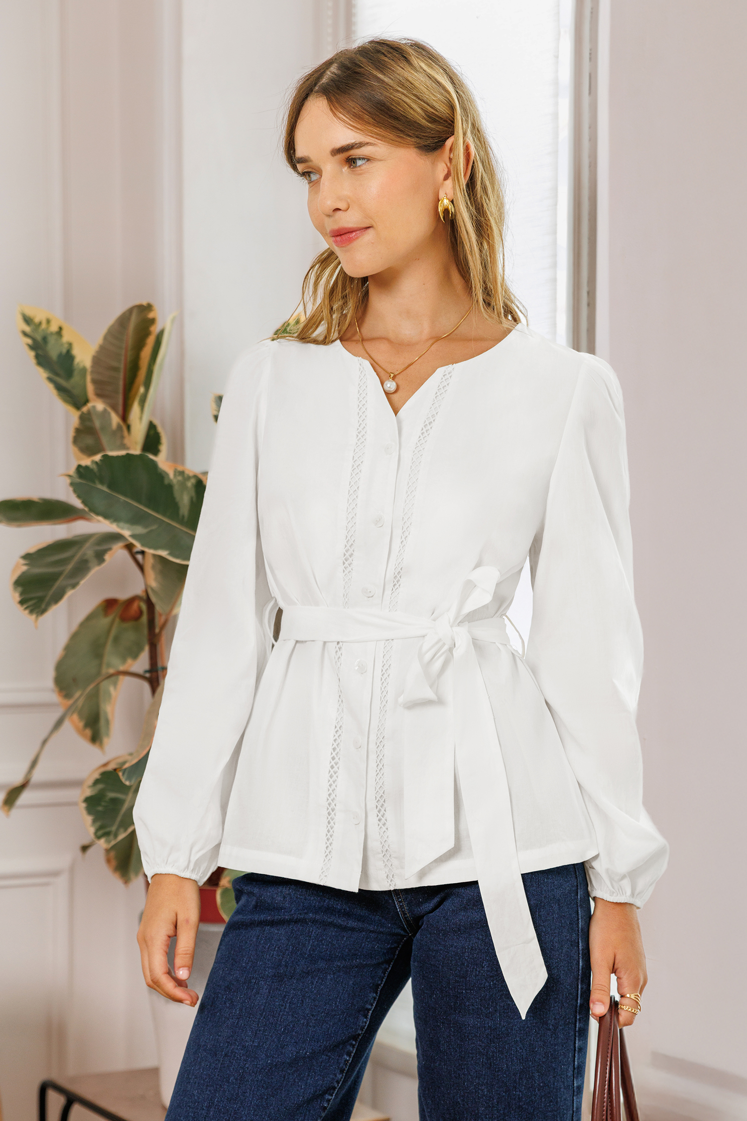 La blouse blanche aux détails fleuris évoque la douceur d’un champ de tournesols ! Son col fendu, ses manches longues et sa fermeture boutonnée créent un look délicat et romantique.
