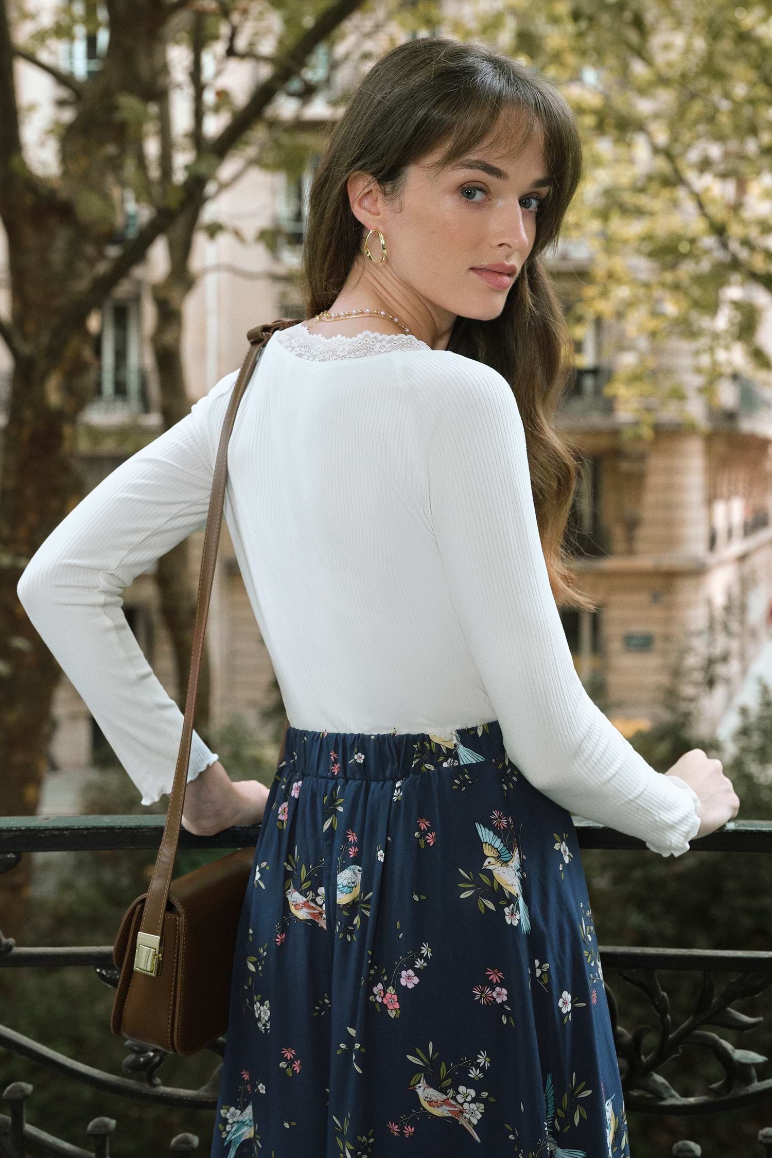 Un haut blanc tendre et raffiné ! Son col rond, ses manches longues et sa dentelle contrastante offrent une note délicate et féminine à toutes vos tenues.