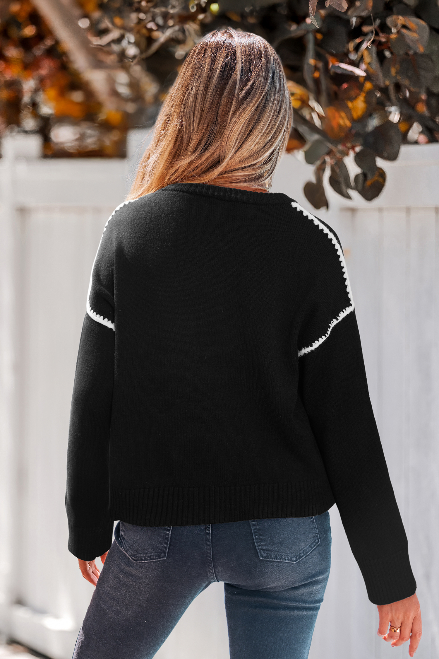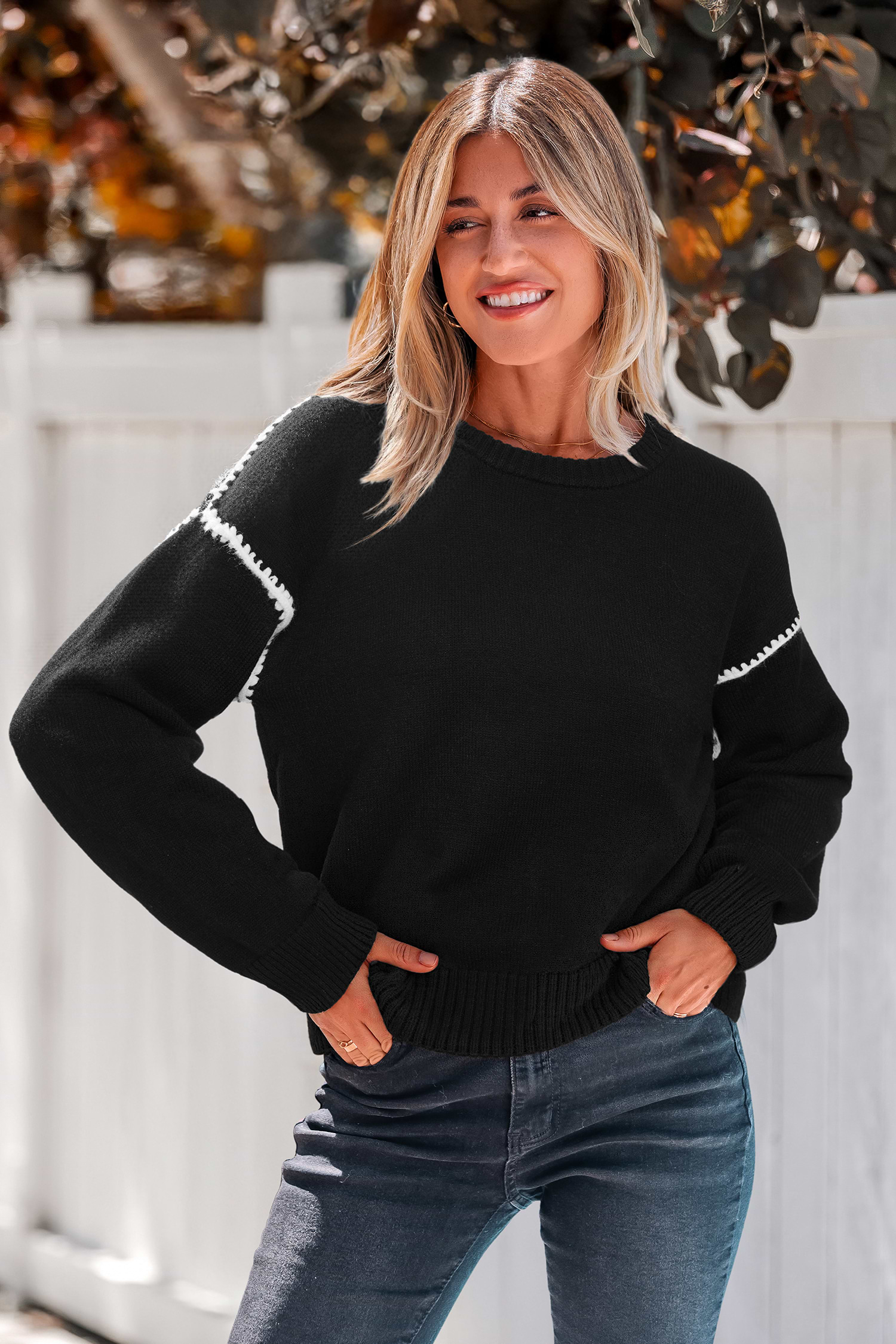 Le pull noir au col rond et manches tombantes est une pièce décontractée parfaite pour un style simple et affirmé.