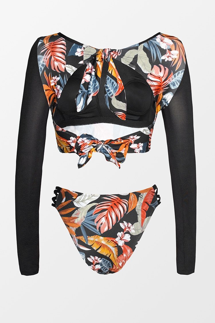 Tankini à manches longues avec nœuds dans le dos et à tropical