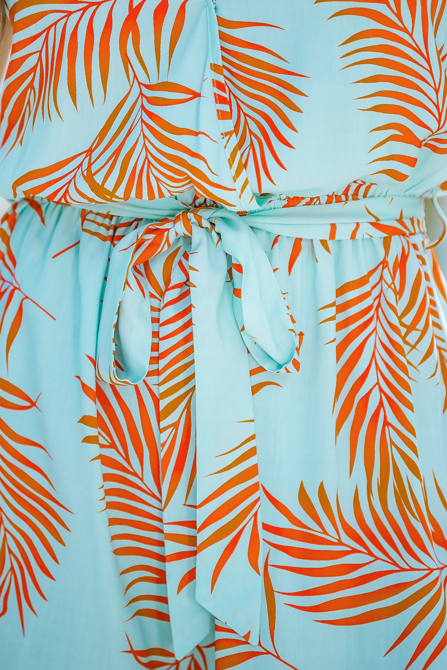 Infusez votre style d'un éclat tropical avec notre combishort avec manches à volants tropical de couleur menthe ! Cette pièce pleine de vivacité incarne sans effort l'esprit de l'été. L'imprimé tropical sarcelle et orange crée une allure exotique, tandis que les manches volantes ajoutent une touche ludique et féminine.