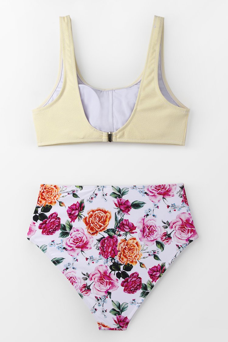 Tie-Front Tank Solide et Bikini Floral À Taille Haute