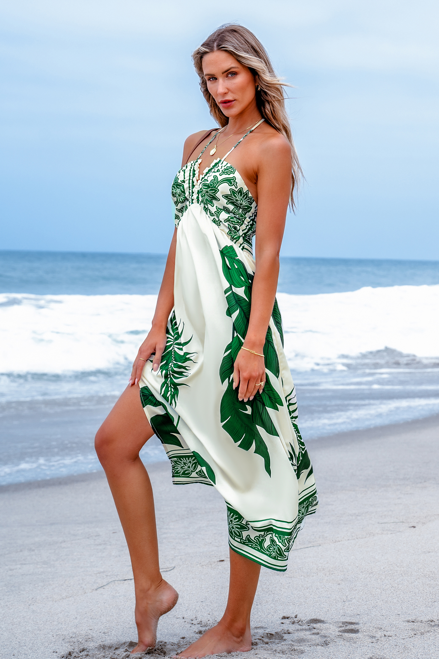Robe maxi à col licou et imprimé floral tropical