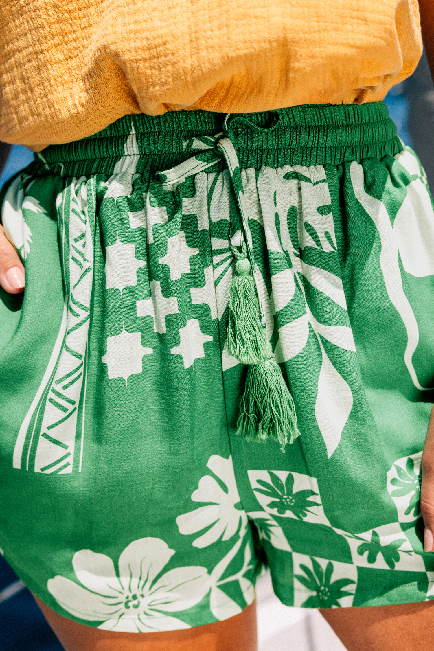 Short avec jambes larges à nouer avec glands tropical
