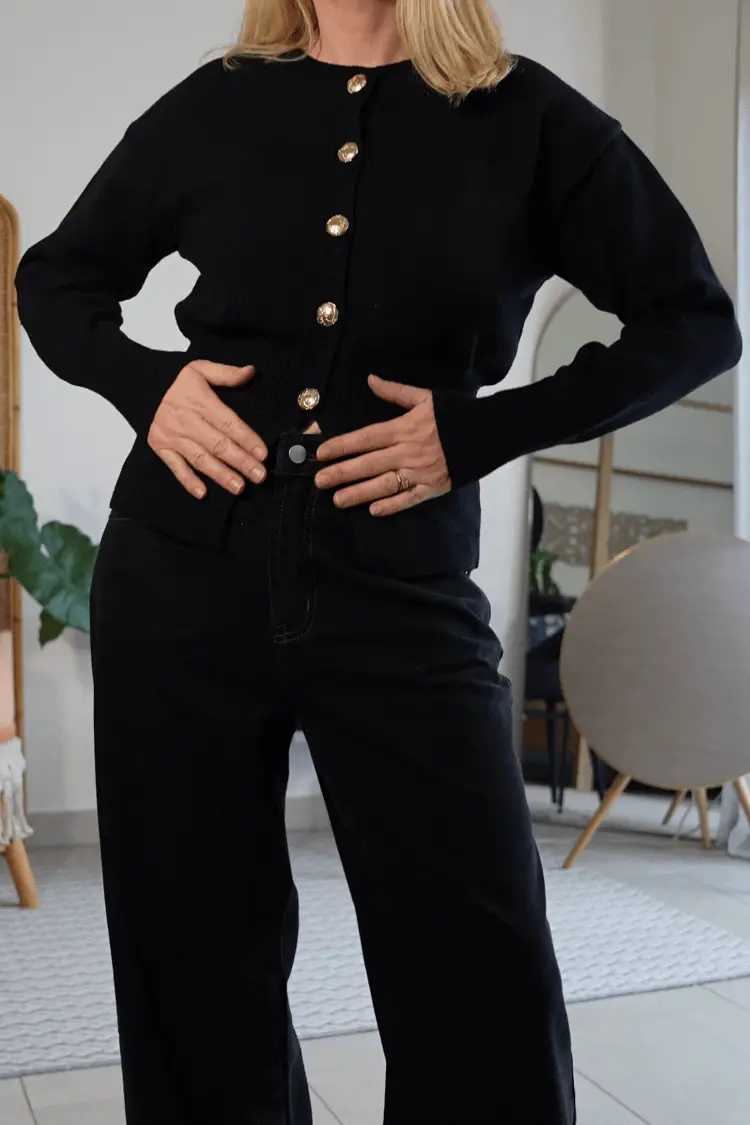 Ce cardigan noir est idéal pour apporter une touche de peps à vos tenues ! Son encolure ronde, ses manches longues et ses boutons dorés lui donnent une élégance subtile.