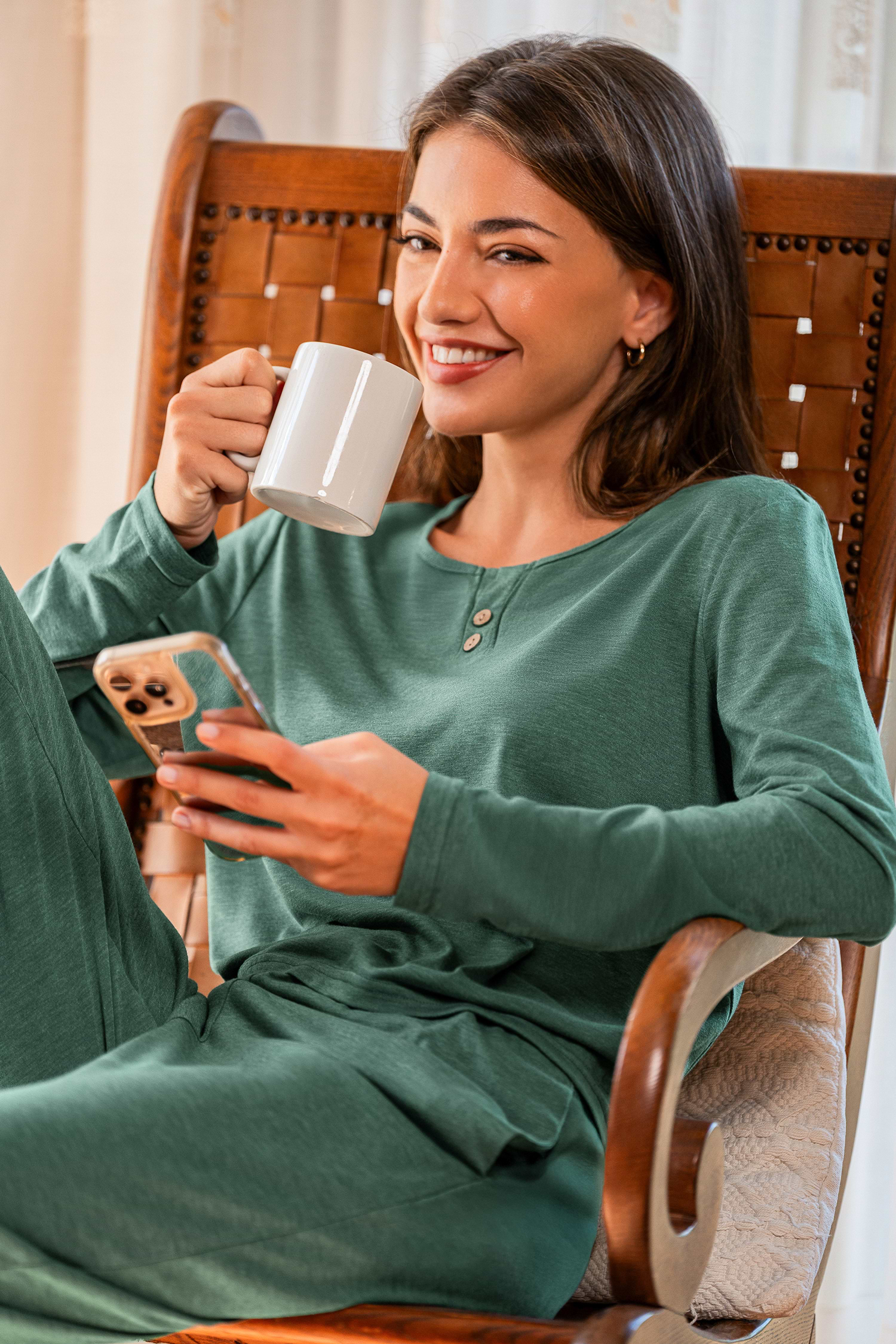 Le pyjama vert rend les matins plus doux ! Son col rond, ses manches longues et son pantalon droit offrent le parfait équilibre entre confort et légèreté.