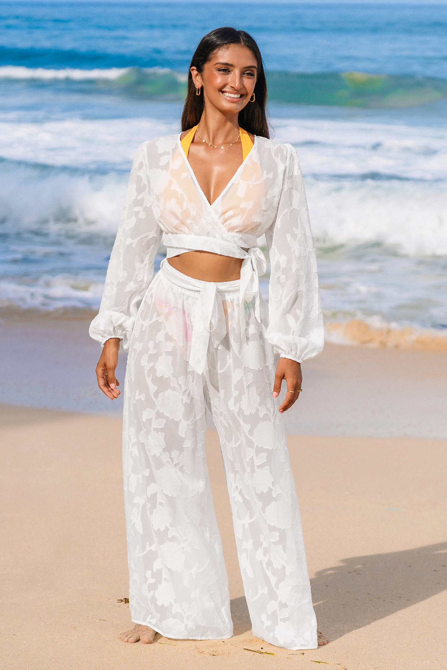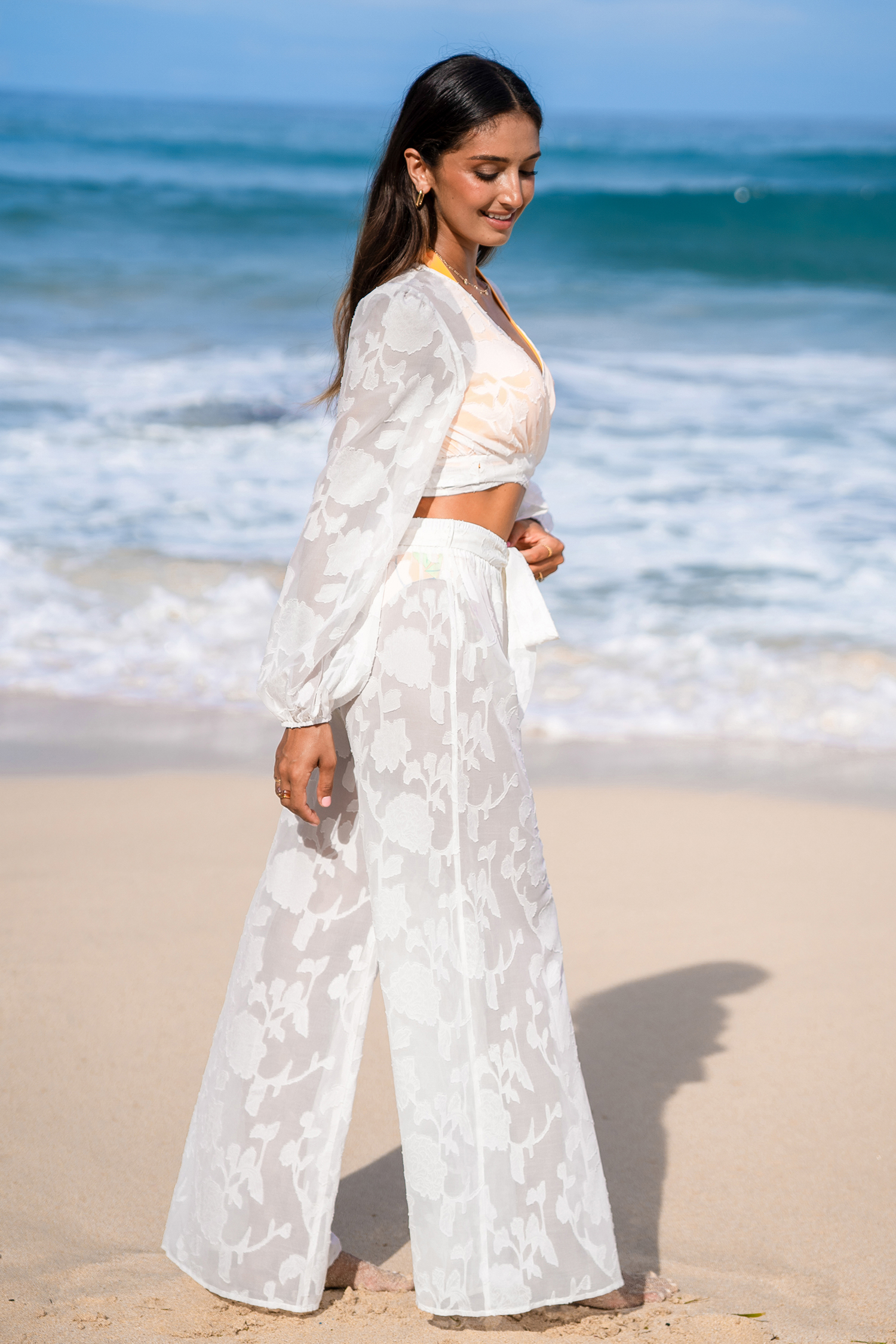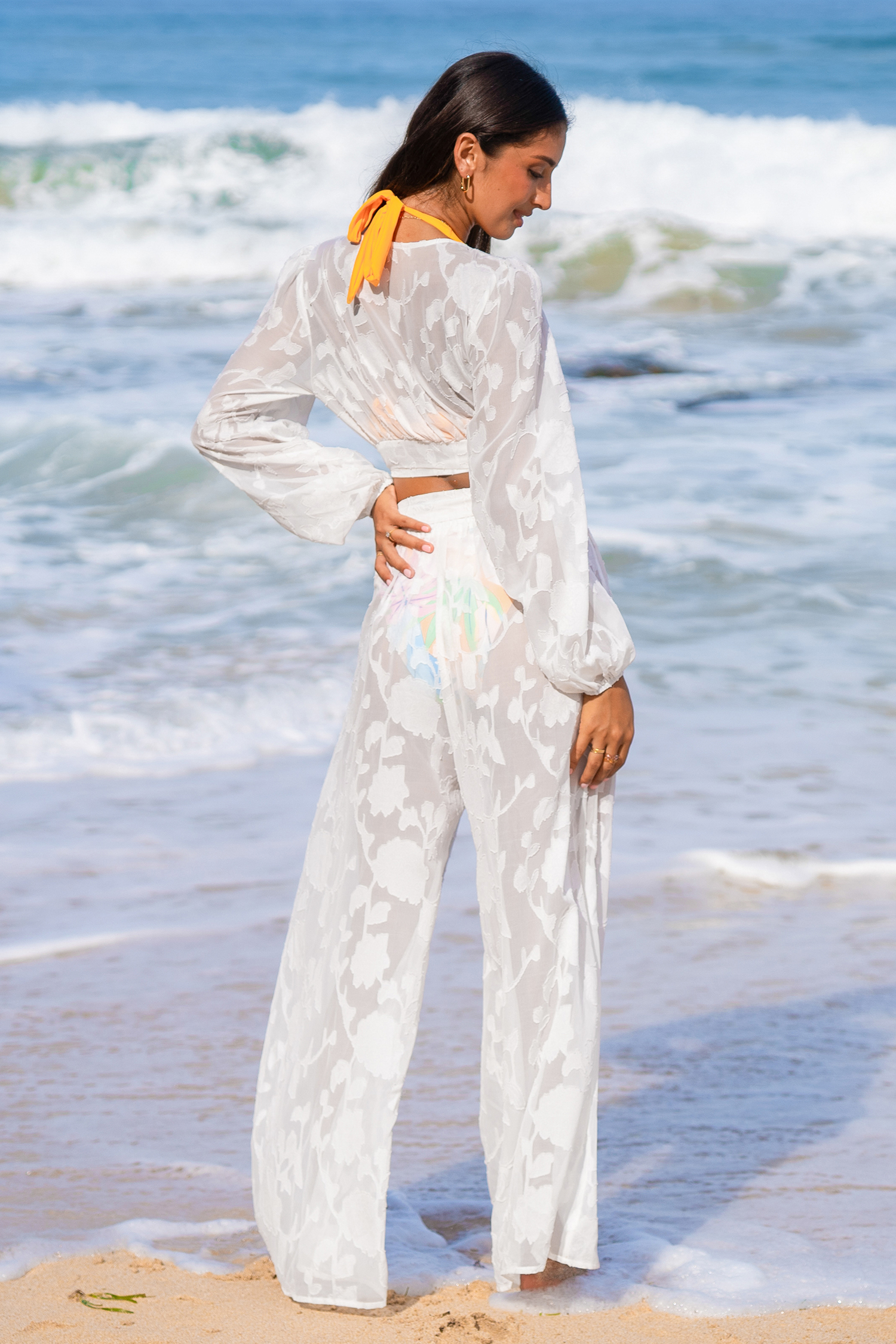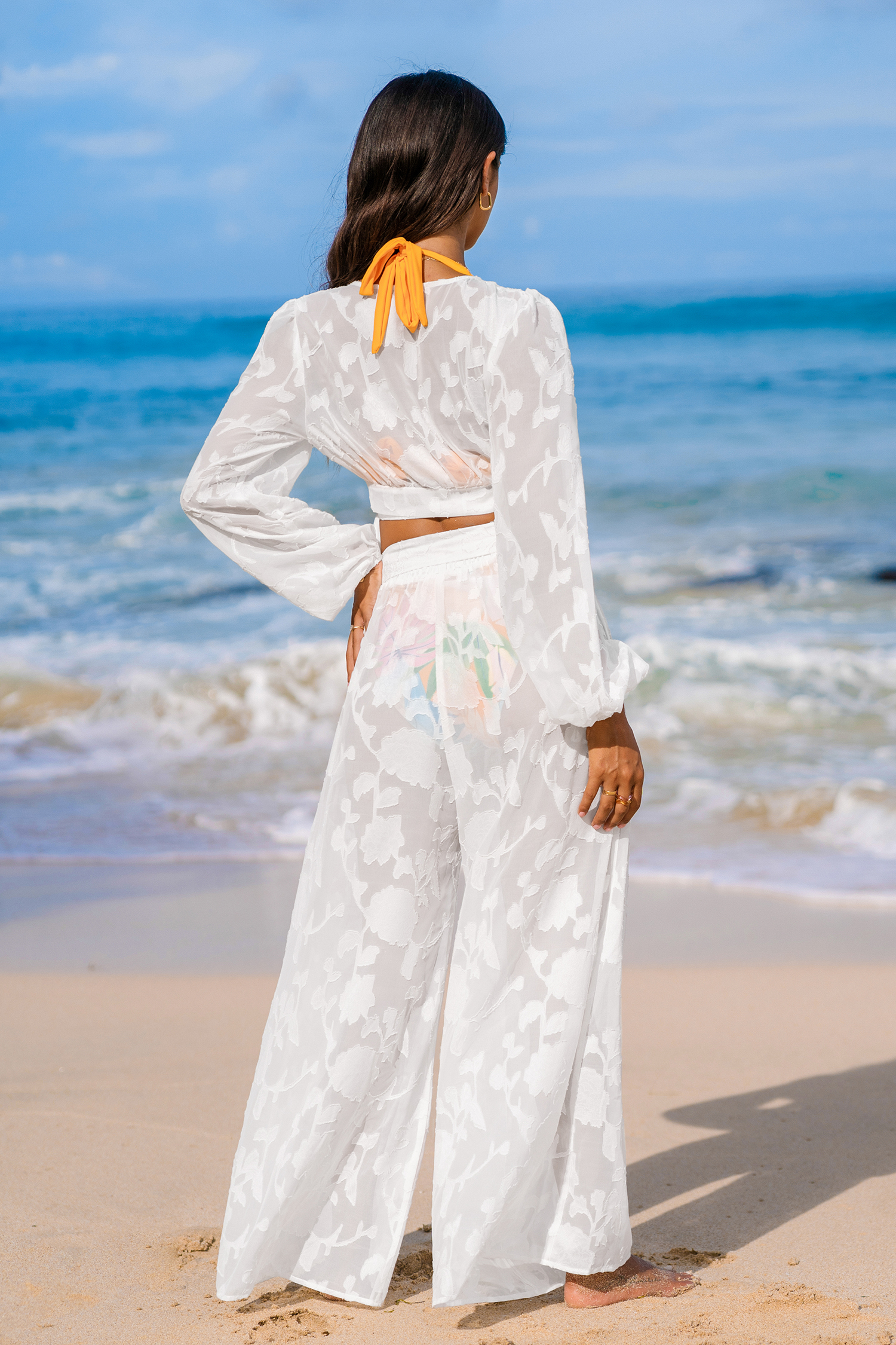 Haut cover up à manches bouffantes et fleurs blanc