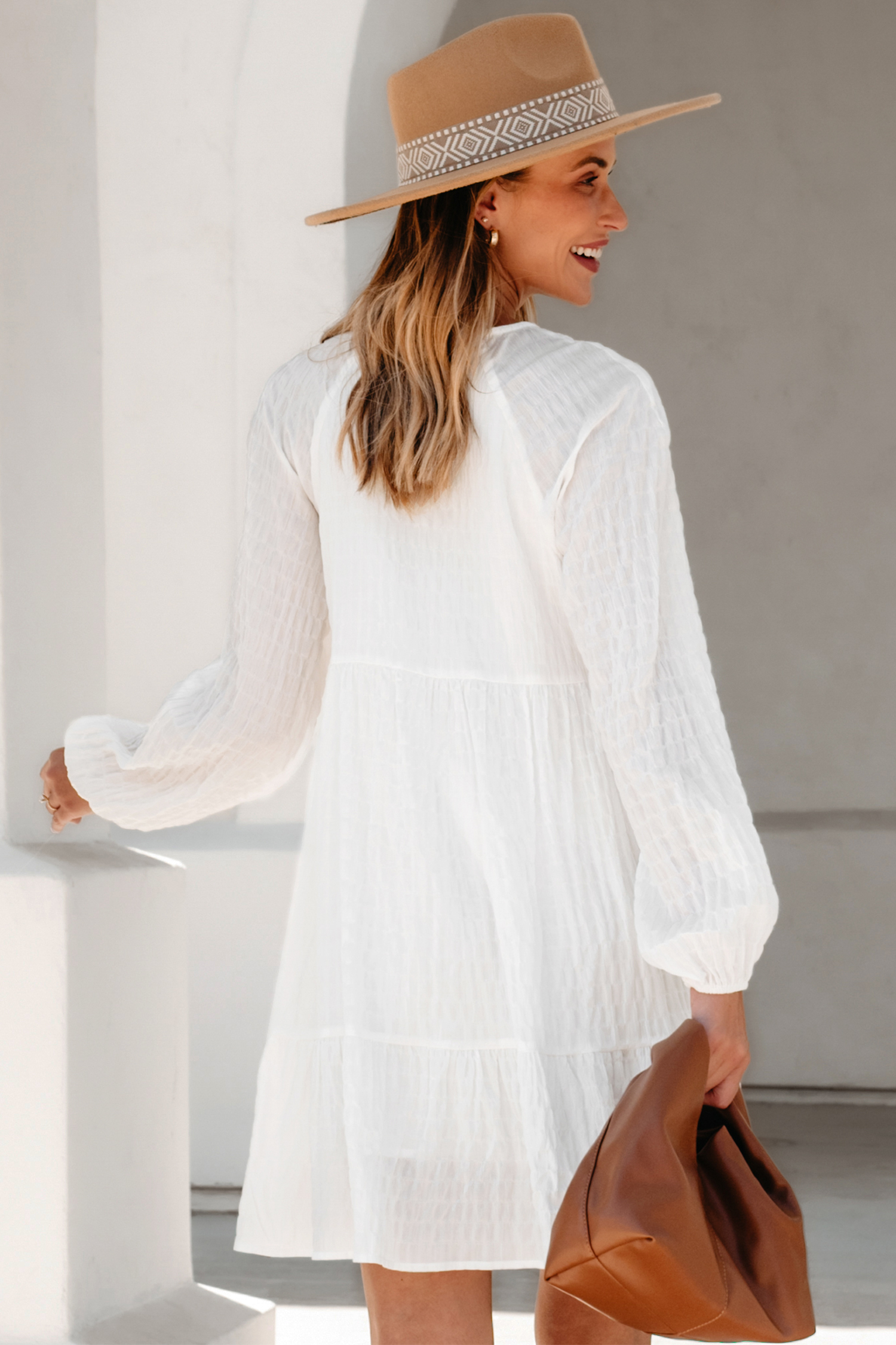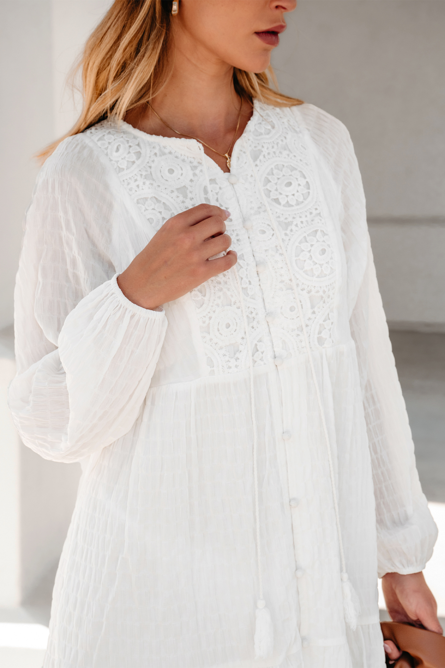 Robe courte à manches blouson avec cravate en dentelle blanche