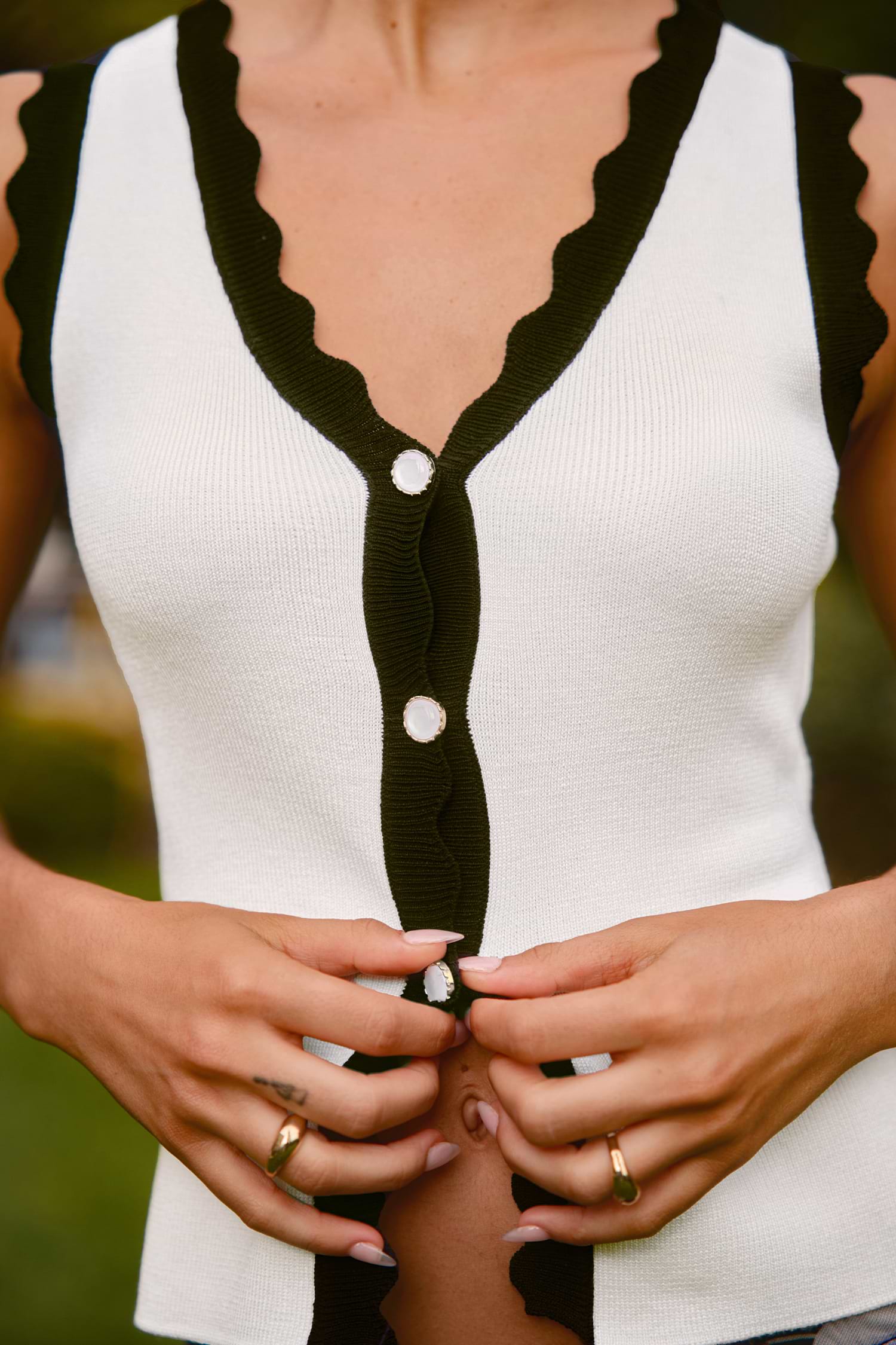 Ce gilet sans manches en maille apporte une allure espiègle et cool sans effort ! Col en V, boutonnage sur le devant, un classique qui s’adapte à toutes vos humeurs.