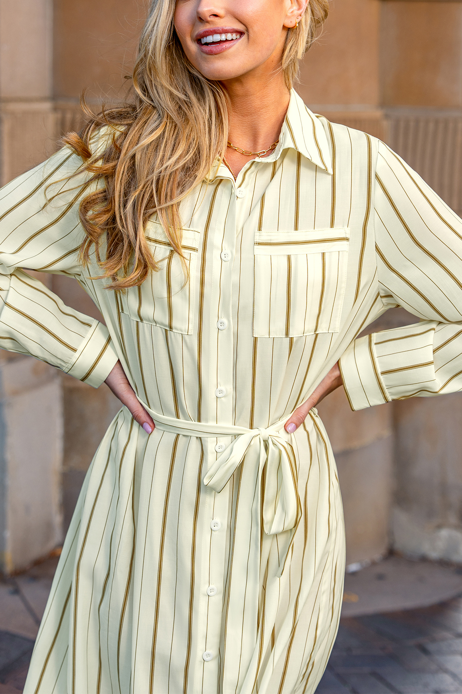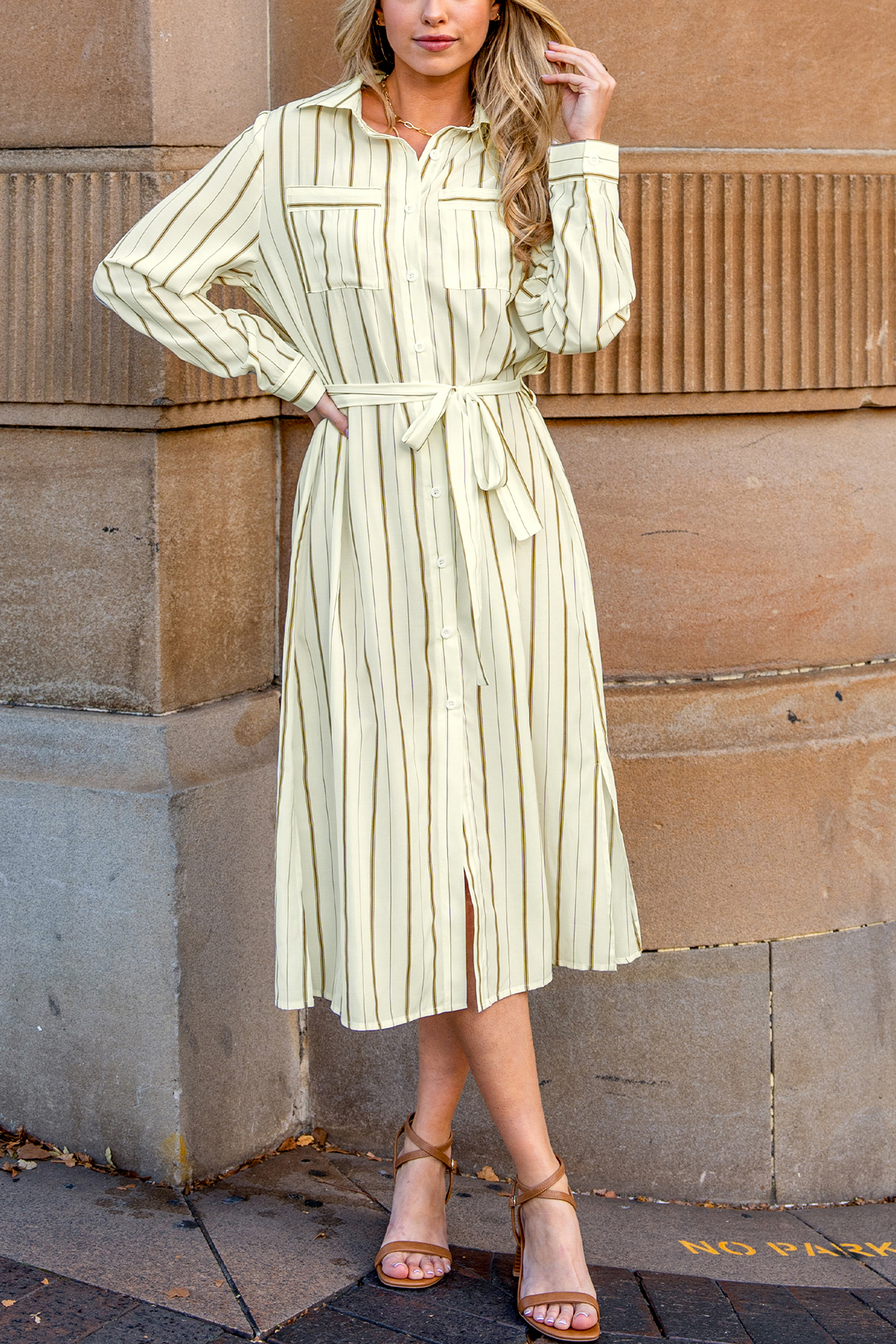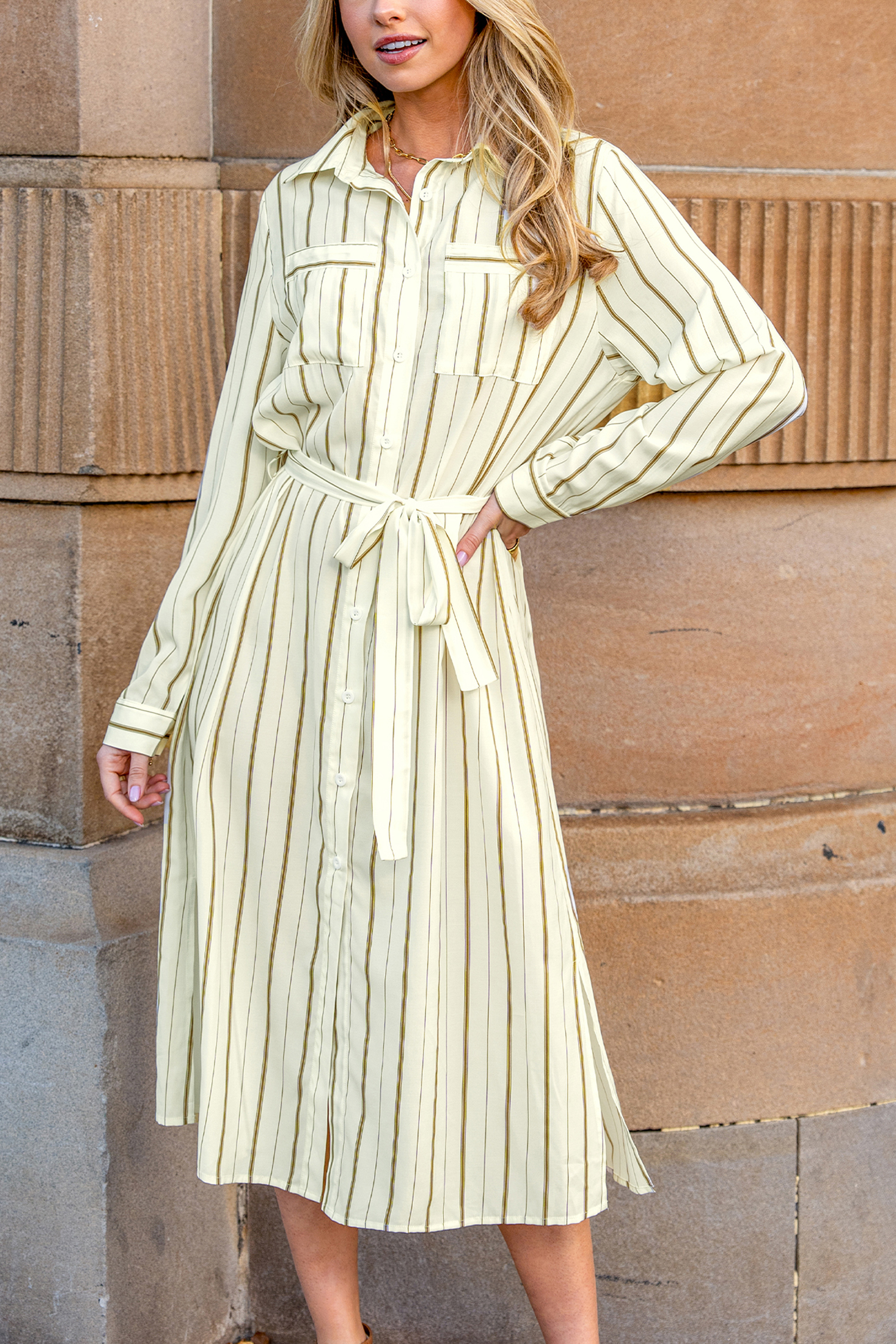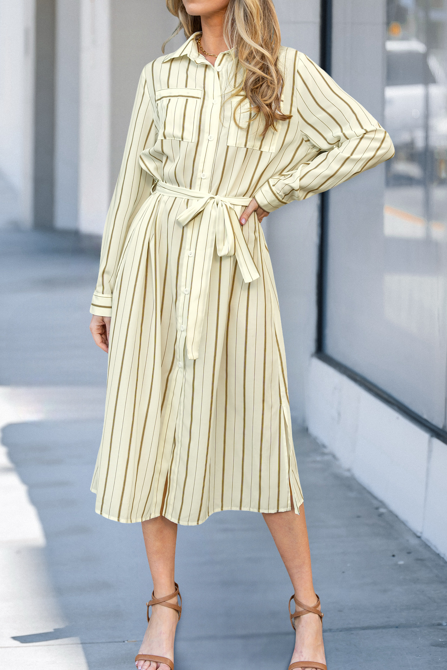 Robe midi à rayures et col de chemise avec manches longues jaune