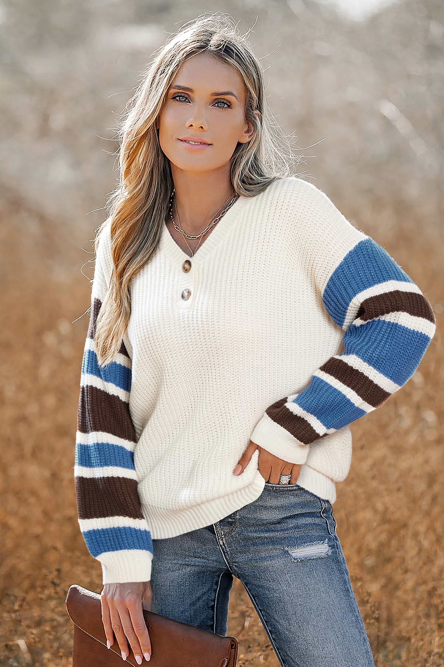 Le pull rayé au col en V et manches longues crée une coupe fluide et flatteuse pour des journées décontractées et confiantes.